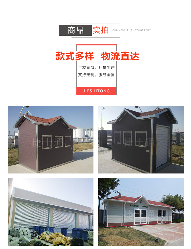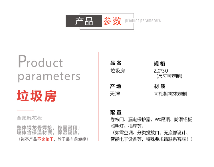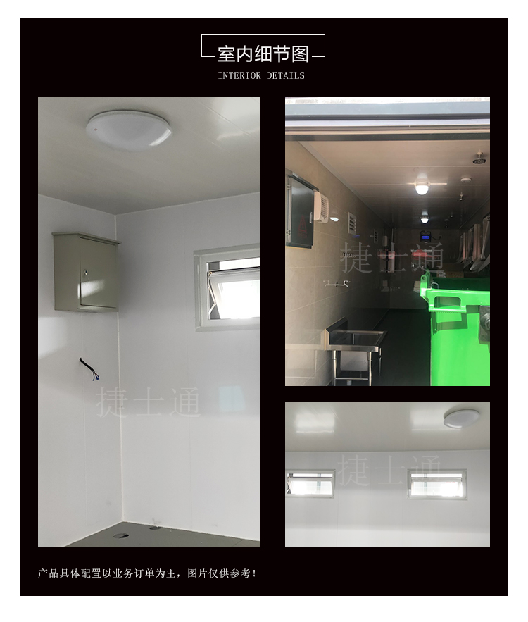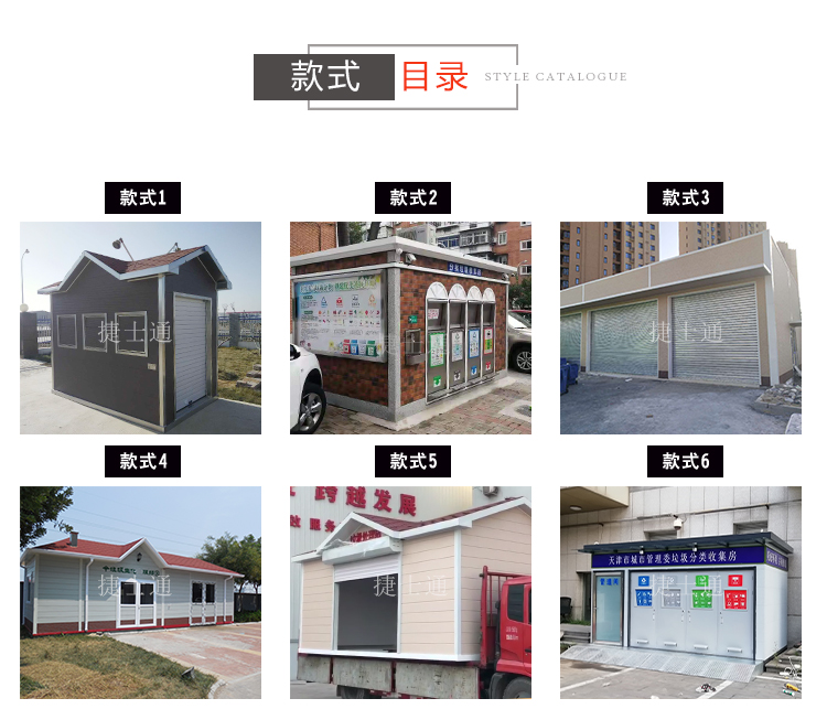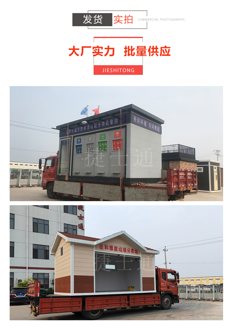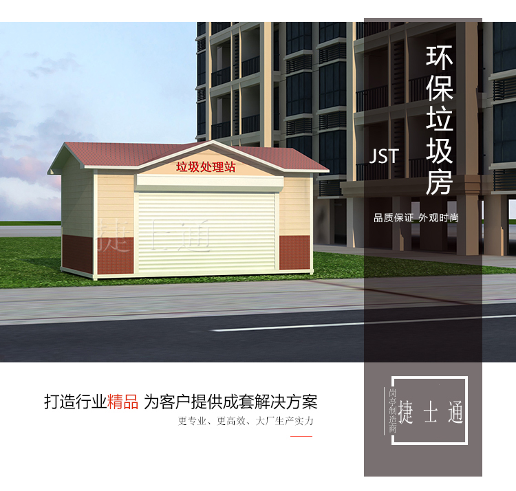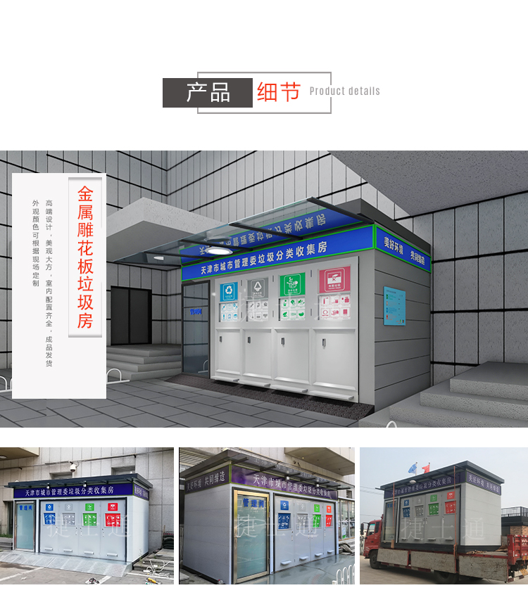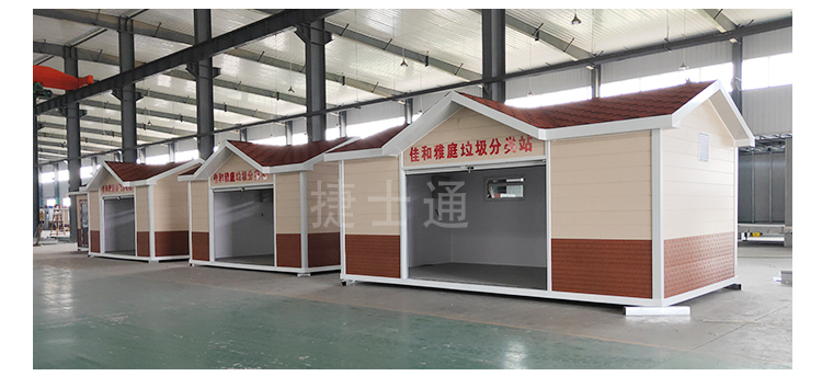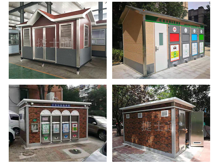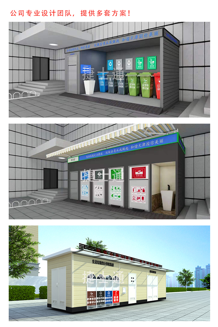 垃圾房标准配置:墙体含保温材料,屋顶镀锌板静电喷涂,PVC吊顶,室内地面:优质防滑铝板/防滑瓷砖可选。门窗:卷帘门、平开门、分类小窗口。其他:照明、配电系统、净手池、监控设备、智能垃圾处理装置,电箱、开关、插座、暗敷电线、照明灯、桌面、抽屉、键盘托、空调架等。可加配:空调等。联系电话:15822882616,公司网址:www.tjsjst.cn。此款是新款垃圾房,设计四个不同的投放口,各司其职。整体发货,外型美观大方,使用范围广。