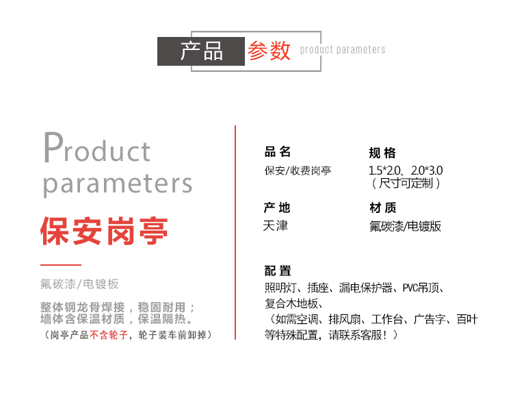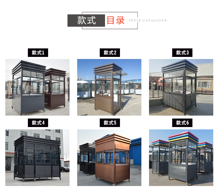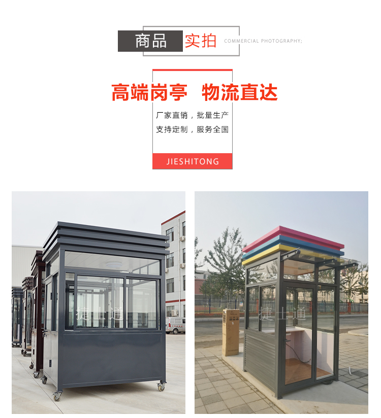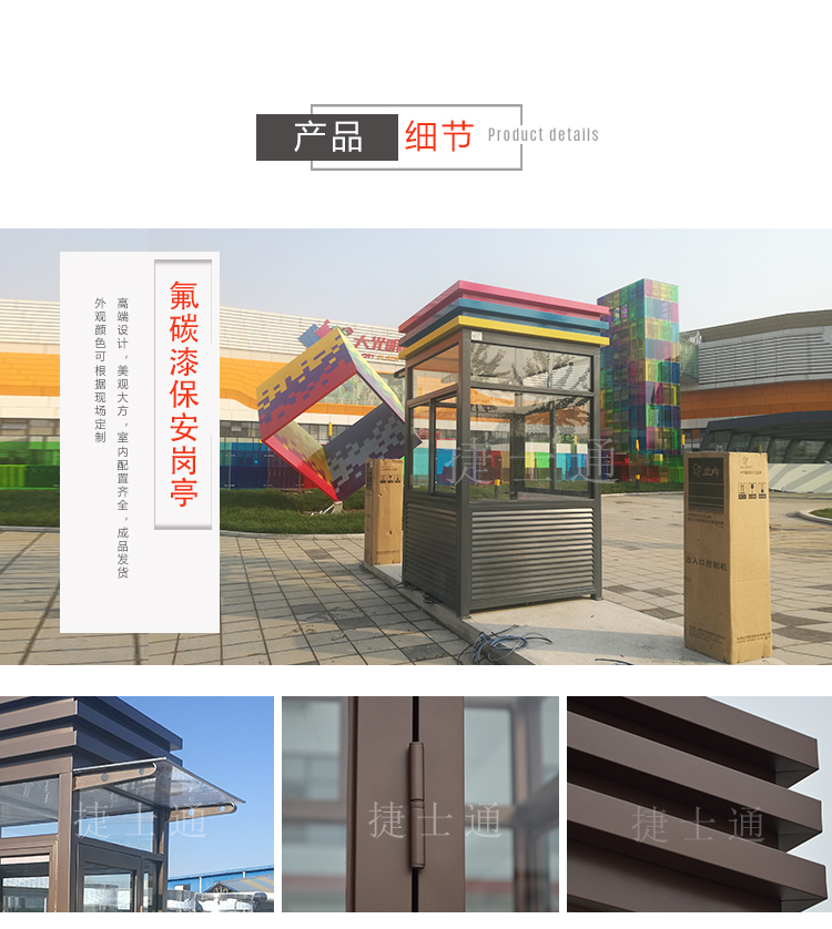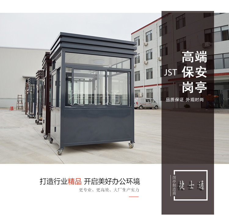 物业保安岗亭 整体成型,结构坚固耐用,具有很强的抗震,抗狂风、防漏雨、抗变形的能力,密封性好不锈钢岗亭,氟碳漆材质,其他材质可分为:金属雕花板、镀锌板、防腐木、氟碳漆...捷士通科技有限公司经营范围:早餐车、门卫室、售票亭、值班室、售卖亭、活动房、报刊亭、防腐木、冷饮车、警务室、小吃车、垃圾房、小木屋、售货车、吸烟亭、办公室、便利店、保安亭......联系电话:15822882616 公司网址:www.tjsjst.cn