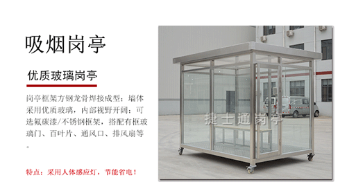 捷士通吸烟岗亭产品主体结构为方钢龙骨焊接,按标准焊接,保证整体结构稳固,岗亭主体墙体为玻璃材质,可以根据需要
